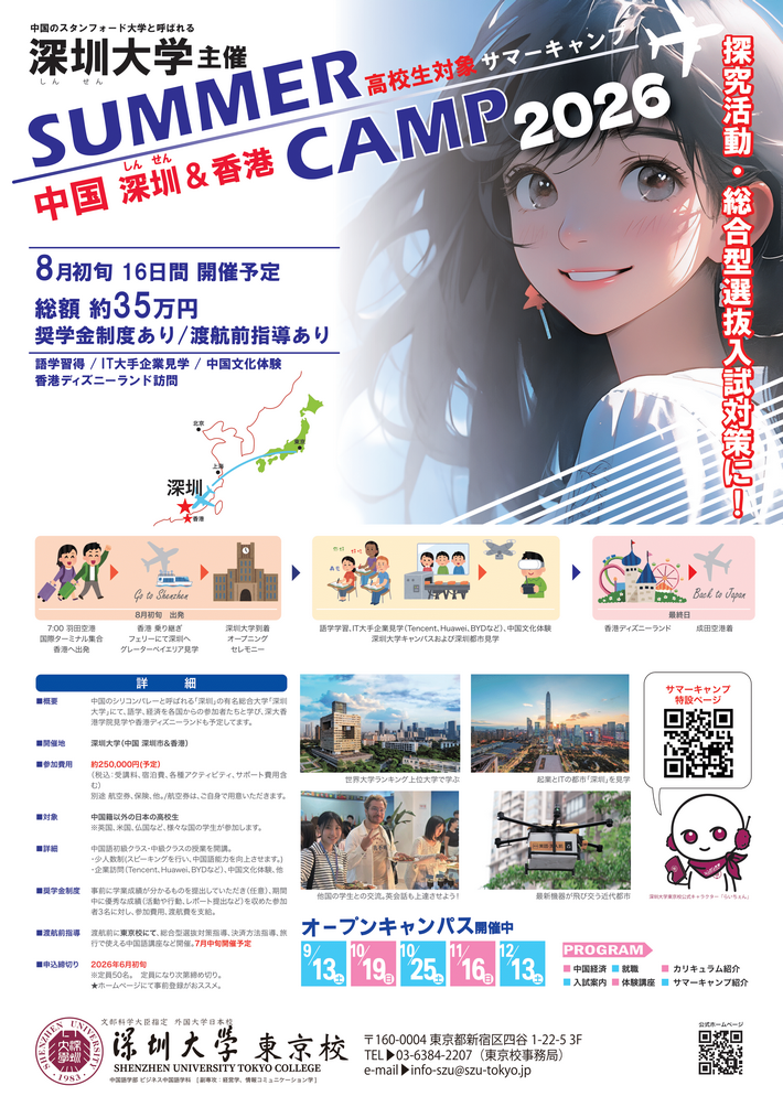 高校生優秀賞・・・・・・2名/深圳大学 SUMMER CAMP2026 招待券(授業料・宿泊費の補助・約20万円相当)